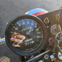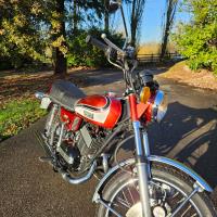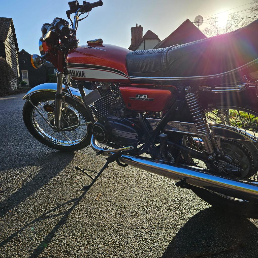 The RD350 two-stroke manufactured by Yamaha from 1973 to 1975. It evolved directly from the piston port (pre-reed valve intake tract), front drum-braked, five-speed Yamaha 350 cc “R5”. The engine is an air-cooled, parallel twin, six-speed (in some markets, such as the UK, the first models were sold in five-speed form), reed valve-equipped intake tract two-stroke engine. The bike is usually referred to as a sport bike. All models were equipped with “Autolube” automatic oil injection, relieving the user from the need to mix petrol and two-stroke oil.
