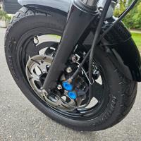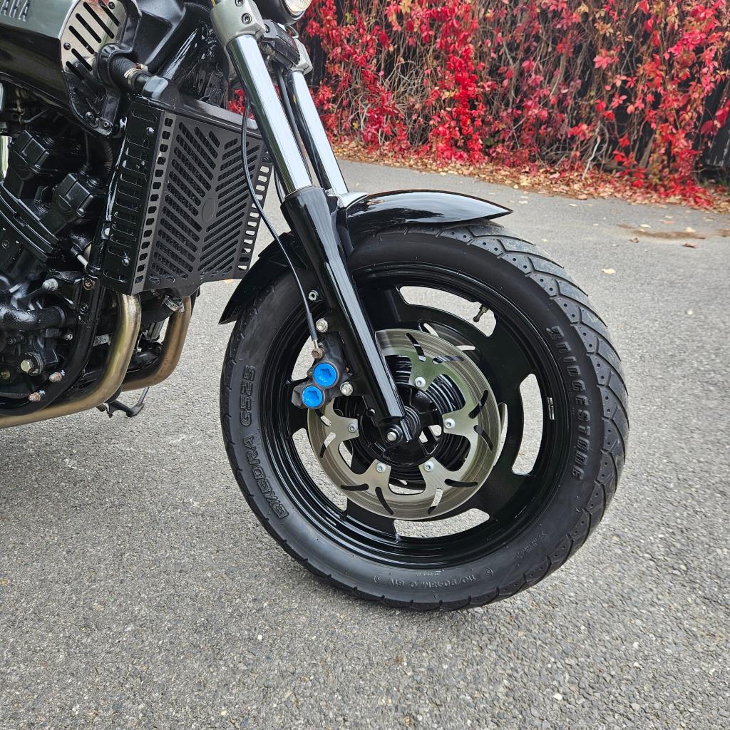This example has had a few upgrades to the bike, mainly the addition of Yamaha’s iconic “blue spot” front brake calipers from the R1. It has also had replacement discs all round coupled with Hel performance braided brake lines, additions that really improve the stopping power of the bike.